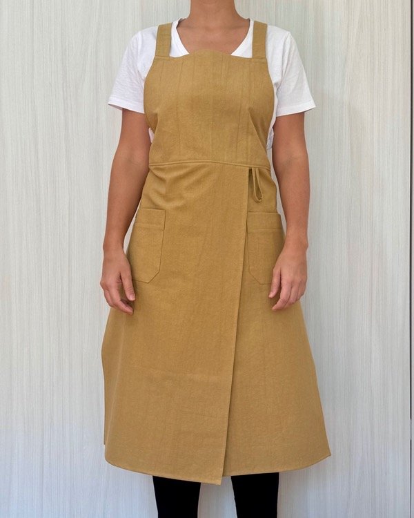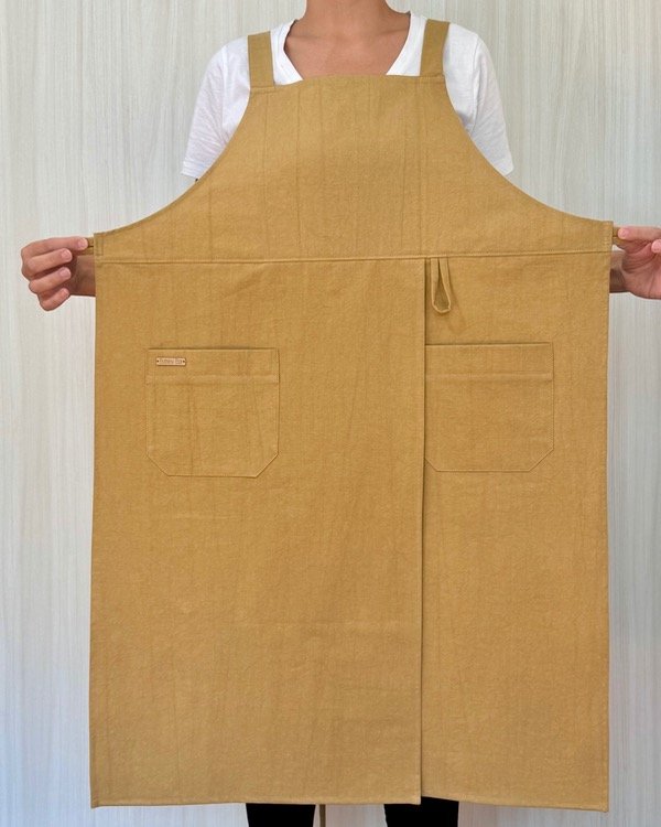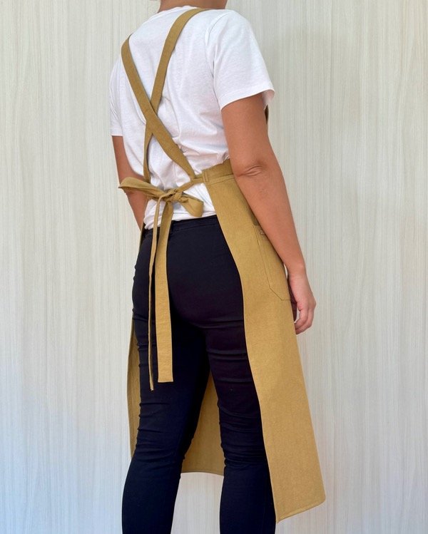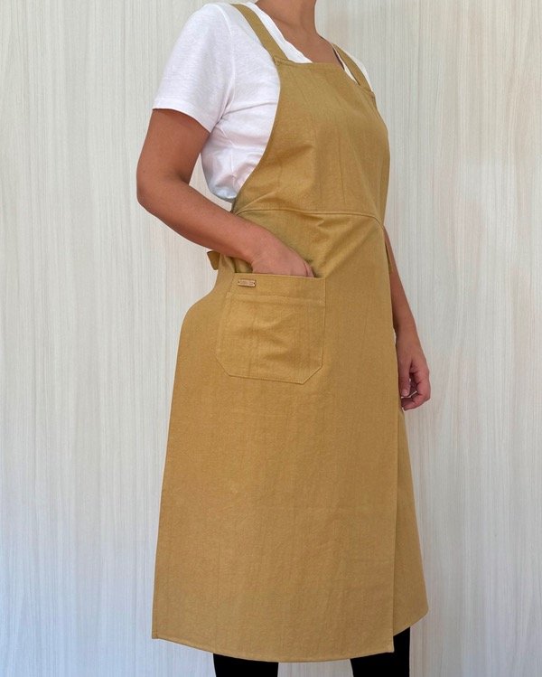 Con tiras de ajuste que se cruzan en tu espalda y no en el cuello, para que el peso del delantal no de dolor de cuello (esto es muy importante a la hora de elegir tu delantal ya que pasas varias horas con él puesto).