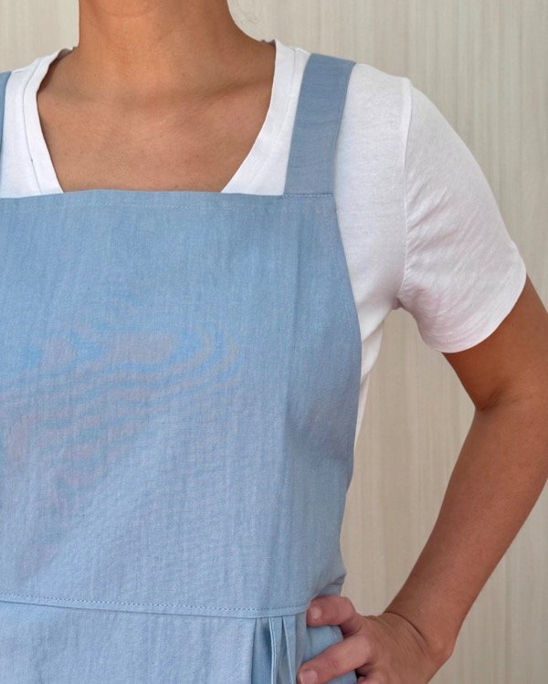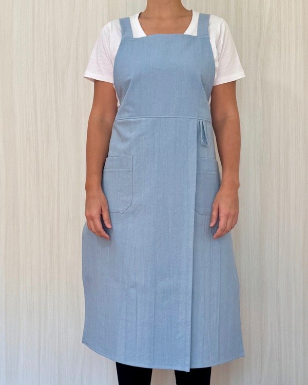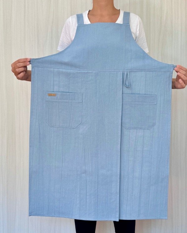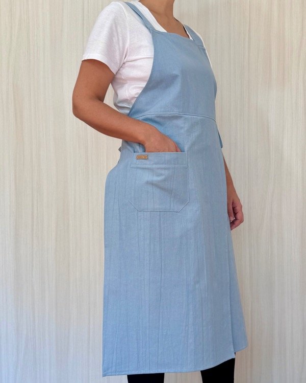 Con tiras de ajuste que se cruzan en tu espalda y no en el cuello, para que el peso del delantal no de dolor de cuello (esto es muy importante a la hora de elegir tu delantal ya que pasas varias horas con él puesto).